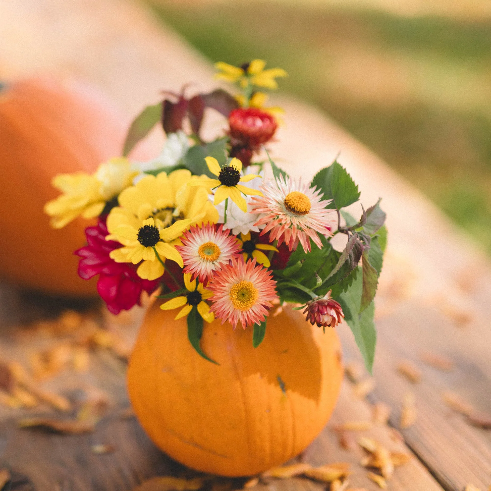 Bring the beauty of the fall season into your home with our stunning Autumn Blooms in Pumpkin Vase. This unique floral arrangement features a vibrant selection of seasonal flowers, including zinnias, strawflowers, and rudbeckia, all displayed in a pumpkin vase. Perfect for adding a rustic, festive touch to your table and autumn gatherings.
